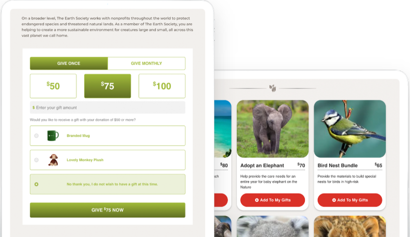 Through FlexFormz, organizations can choose if they want their donors to designate gifts for specific areas, give in honor or memory of someone, or choose a premium to receive with their gift. A Gift Catalog plugin is now available.